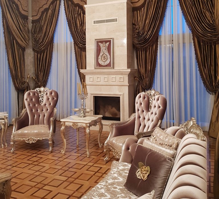 Florya’da gerçekleştirilen bu iç mekân dekorasyon projesi, klasik saray estetiğini modern yaşam konforuyla buluşturmaktadır. Yüksek tavanlı mekânda kullanılan kristal avize, oymalı mobilyalar ve kadife döşemeler zarif bir atmosfer oluşturur. Özel tasarım şömine ve simetrik yerleşim kurgusu mekânsal bütünlüğü güçlendirirken, ağır fon perdeler ve seçkin tekstil detayları ihtişamlı bir karakter kazandırır. Doğal tonların hâkim olduğu renk paleti, mekânda sıcaklık ve denge sağlayarak zamansız bir iç mekân kimliği ortaya koymaktadır.