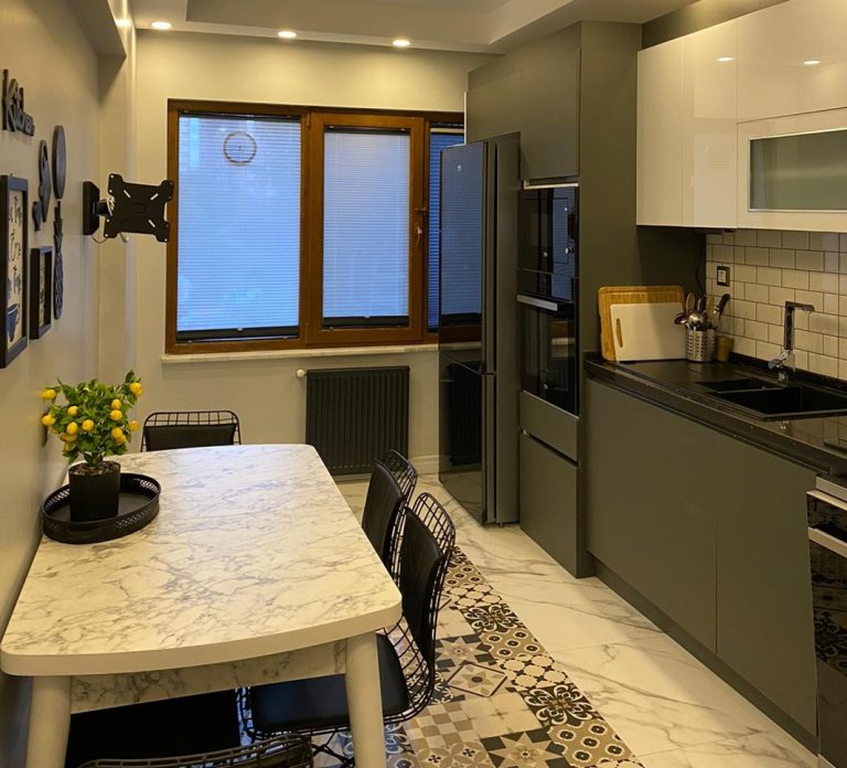 Gerçekleştirdiğimiz mutfak dekorasyon projelerinde, modern çizgiler ile fonksiyonelliği bir araya getirerek kompakt alanlarda maksimum verimlilik hedefliyoruz. Mat yüzeyli dolap kapakları, entegre ankastre çözümler ve siyah tezgâh detayları çağdaş bir tasarım dili oluştururken, mermer görünümlü zemin ve metro seramik kaplama mekâna dengeli bir karakter kazandırmaktadır. Doğal ışıkla desteklenen planlama anlayışımız, hem estetik hem de ergonomik bir kullanım deneyimi sunmaktadır.