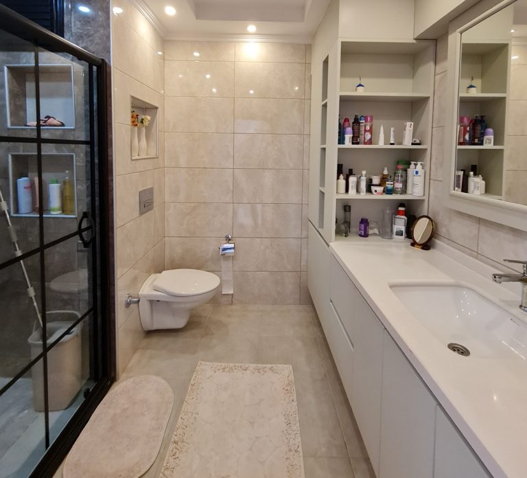 Gerçekleştirdiğimiz banyo dekorasyon projelerinde, modern çizgileri fonksiyonel detaylarla birleştirerek estetik ve konforu bir arada sunuyoruz. Mermer görünümlü büyük ebatlı seramik kaplamalar mekâna bütüncül ve sofistike bir karakter kazandırırken, siyah çerçeveli cam duş sistemi güçlü bir tasarım vurgusu oluşturur. Duvar içi…